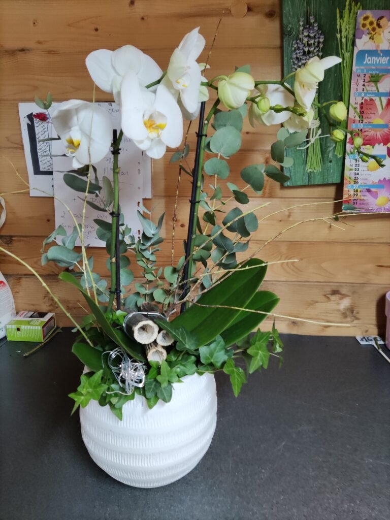 Les couleurs, les variétés de fleurs et la forme peuvent être modifiées selon vos envies et la disponibilité en magasin, tout en respectant l’esprit et le style de la création choisie.